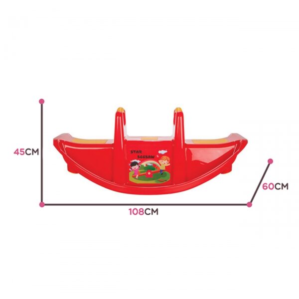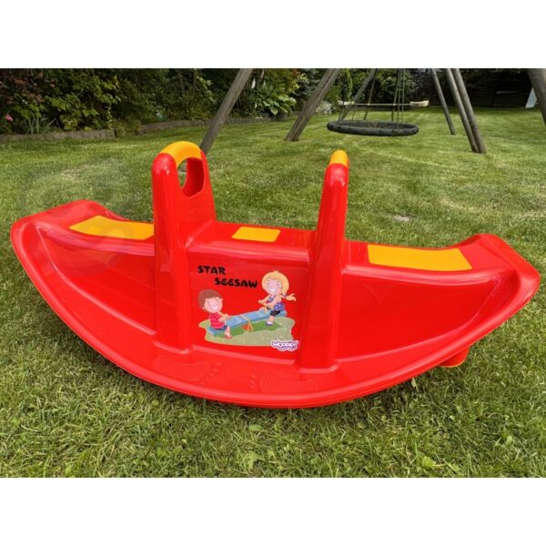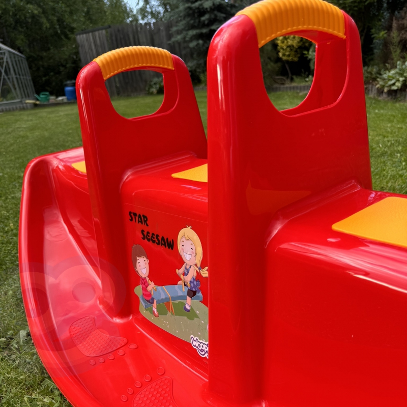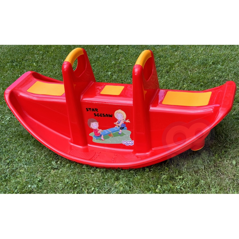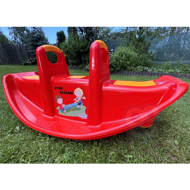 Bujak Wieloosobowy STAR Czerwony marki Woopie jest prawdziwą gwiazdą wśród dzieci! Z bujaka może korzystać maksymalnie troje dzieci jednocześnie, a nawet jedno będzie się świetnie bawić. Gdy dzieci bujają się we dwójkę to dodatkowo rozwija u nich zdolności do współpracy. Bujaczek posiada specjalne nakładki antypoślizgowe na siedzisko oraz chroniące rączki. Bujak sam w sobie dostarcza wiele korzyści dla dzieci. Bujanie samo w sobie uspokaja dziecko oraz rozwija zdolności motoryczne ciała, co jest idealne dla prawidłowego rozwoju. Z huśtawki można korzystać zarówno w domu jak, i na zewnątrz!
