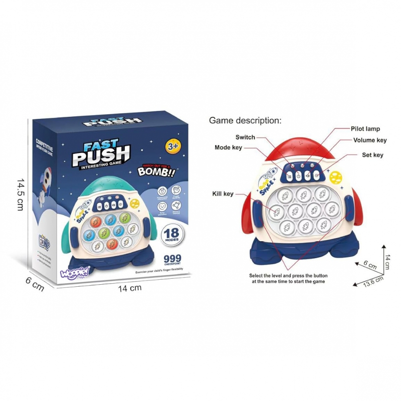 Gra POP IT Rakieta to zabawka antystresowa, która sprawdzi się już dla najmłodszych. Gra wydaje radosne dźwięki, które zachęcają dzieci do zabawy i urozmaicają rozgrywkę. Zabawka jest niewielka więc, sprawia, że możemy zabrać ją ze sobą. Pop It sprawia frajdę dzieciom oraz dorosłym, którzy chętnie po nią sięgają. Rozwija umysł, zdolności manualne, koordynację wzrokowo-ruchową oraz trenuje spostrzegawczość i pomaga w walce ze stresem.