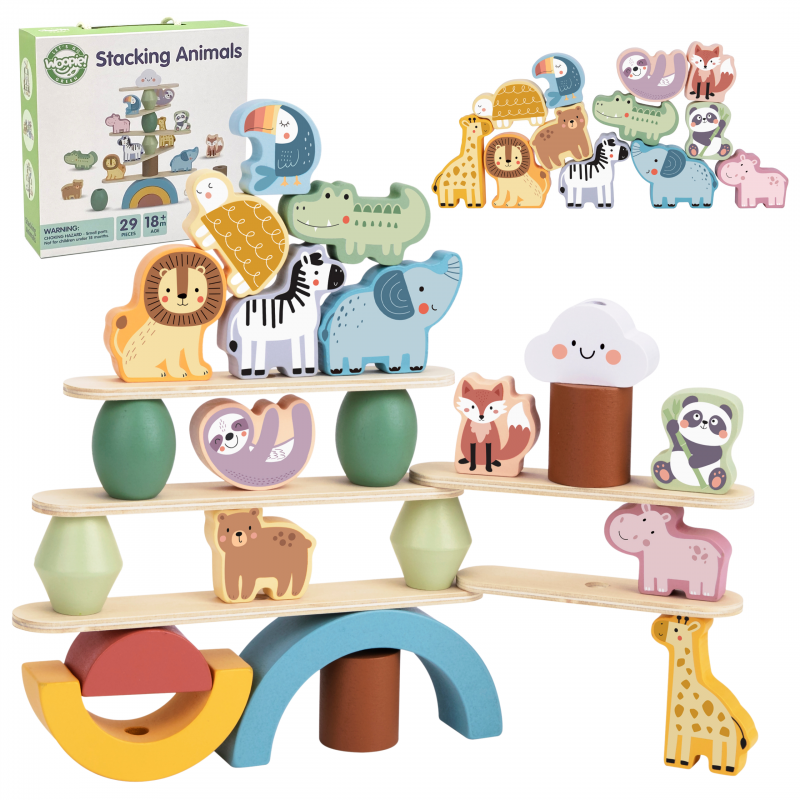 Drewniane zwierzęta do układania w stosy od marki Woopie to fascynująca i edukacyjna zabawka, która inspiruje wyobraźnię i dokonali umiejętności motoryczne u najmłodszych. W zestawie znajduje się 12 uroczych drewnianych zwierzątek oraz 16 akcesoriów do balansowania, takich jak drewniana tęcza, kamienie, platformy oraz wesoła chmurka.