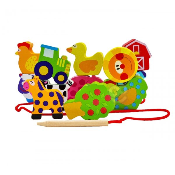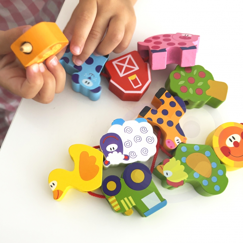 - – zabawa polega na przeplataniu sznureczka przez klocki/zwierzątka z dziurką