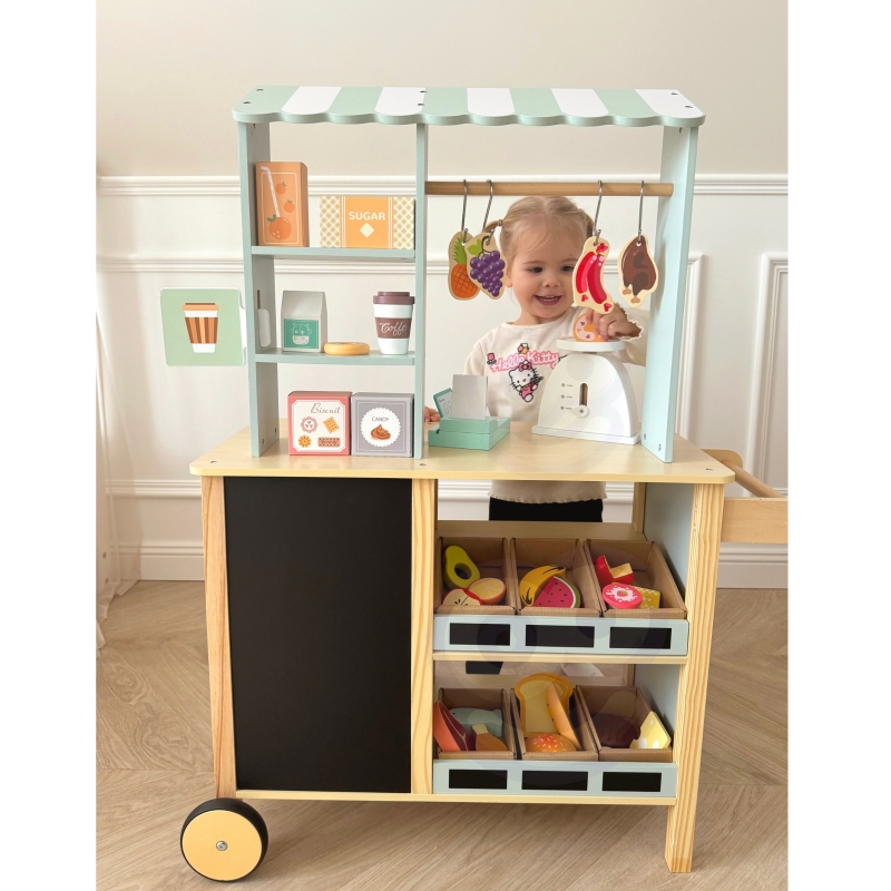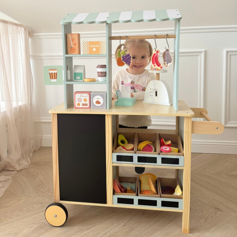 - Kreatywność – Zabawa w Drewniany Sklep Spożywczy rozwija kreatywność dziecka, pozwalając mu na tworzenie różnych scenariuszy zakupów. Dzieci mogą wymyślać, jakie produkty będą kupować, jak je wystawiać na straganie, a także organizować różne role, jak sprzedawca i klient. Ta swoboda w tworzeniu fabuł sprzyja rozwijaniu twórczego myślenia i pomysłowości.