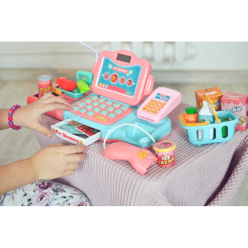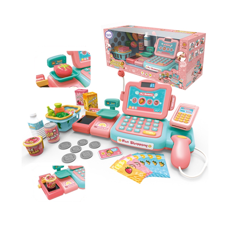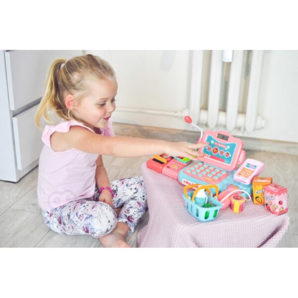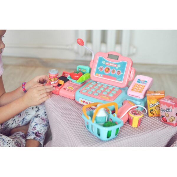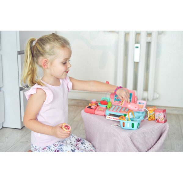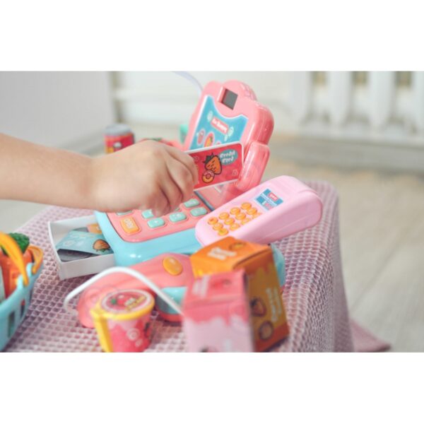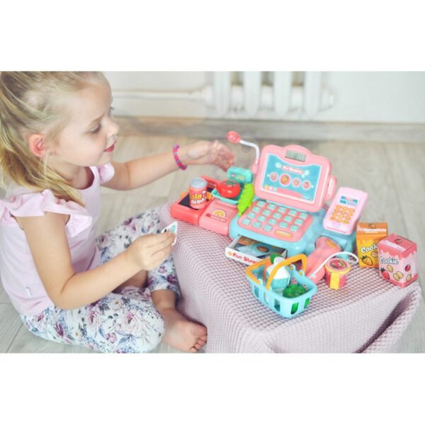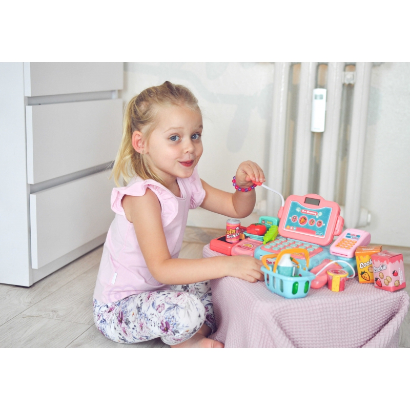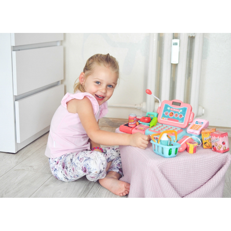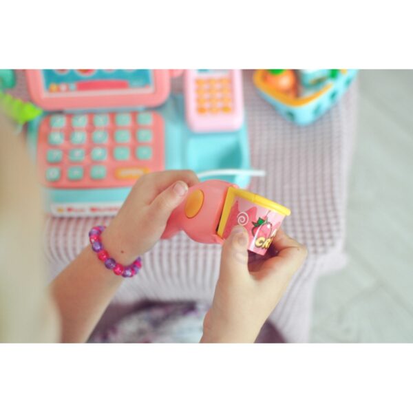 Kasa Sklepowa z wieloma dodatkami od Woopie to idealny pomysł dla dzieci powyżej 3 roku życia. Zabawka rozwija wyobraźnię dzieci i zachęca je do kreatywnego myślenia. Dzieci mogą ważyć owoce i warzywa, a następnie nabić je za pomocą klawiatury na kasę. Przy pomocy czytnika dzieci zeskanują paczkę ciasteczek lub butelkę wody. Następnie będą mogły zapłacić na dwa sposoby: tradycyjnie za pomocą pieniędzy lub za pomocą karty płatniczej. Wszystko to jest dołączone do zestawu i zapewni dziecku długie godziny zabawy.