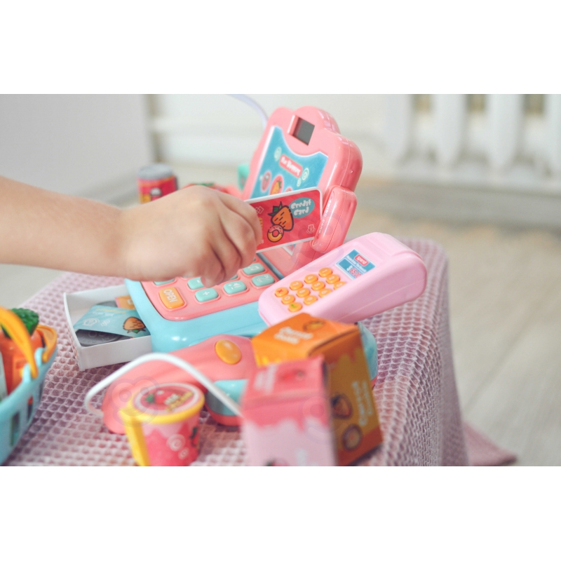 - – Do zestawu dołączono: koszyk na zakupy, warzywa, owoce, paczkę ciasteczek, kartę płatniczą, sztuczne banknoty i monety, telefon, butelkę wody, colę i lody,