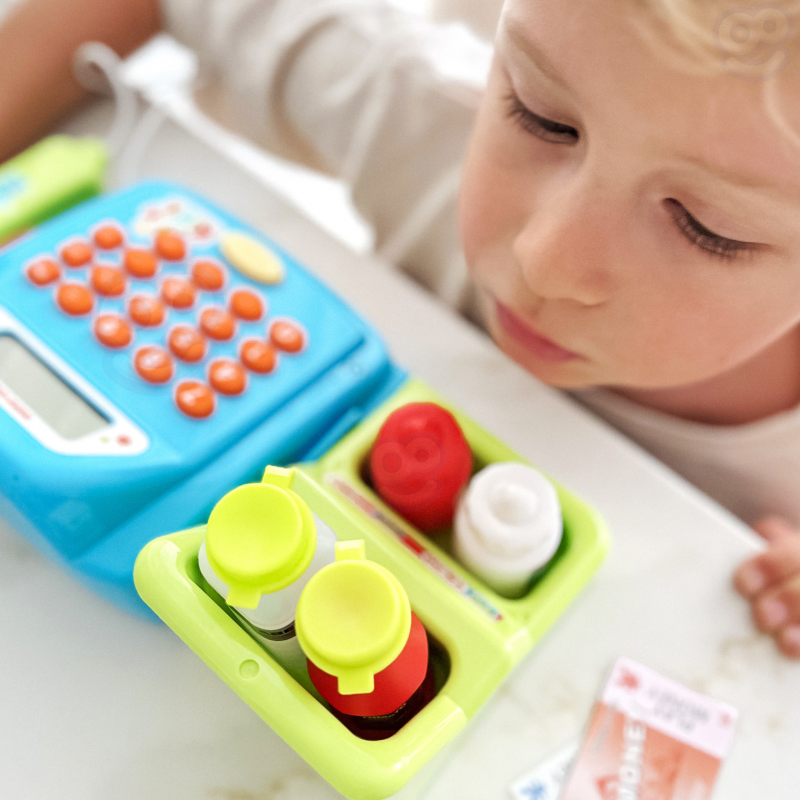 Kasa sklepowa z Półką od marki WOOPIE to idealna propozycja zabaw. Dzieci mogą wybrać produkty, które chcą kupić, a następnie nabić je na kasę. Przy pomocy czytnika zeskanują ciasteczka i inne produkty. Następnie kupujący może zapłacić pieniążkami lub kartą płatniczą.