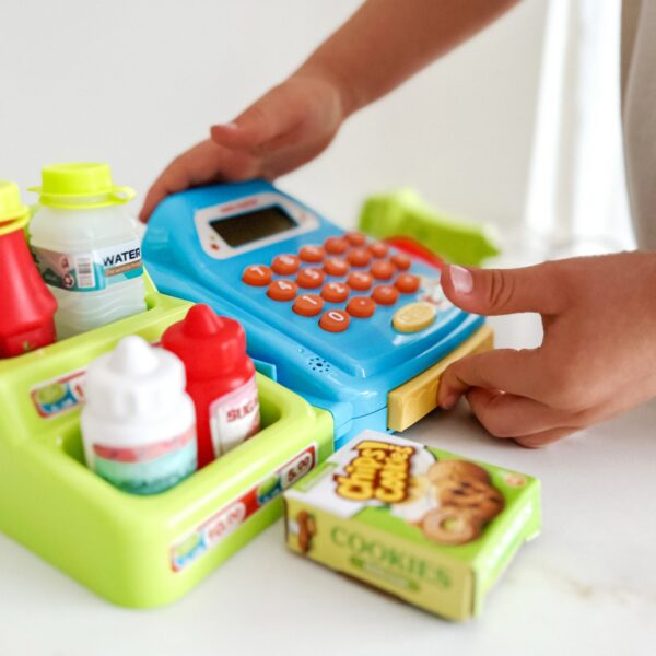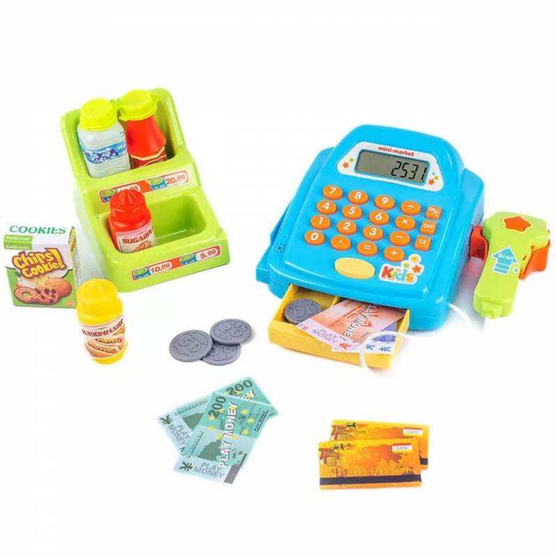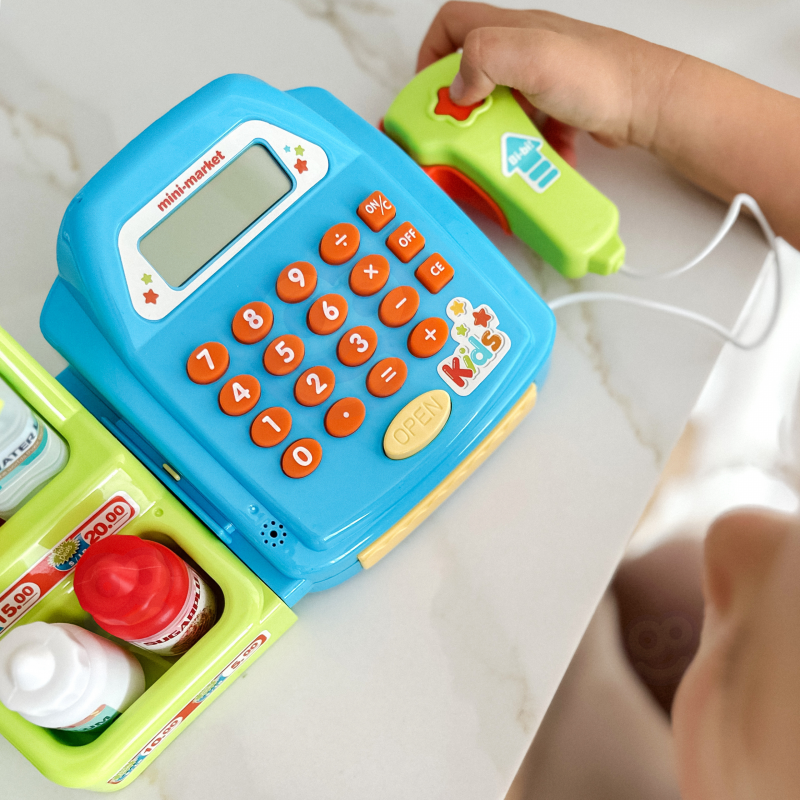 - – kasę sklepową z kalkulatorem i otwieraną kasetka na przechowywanie pieniążków,