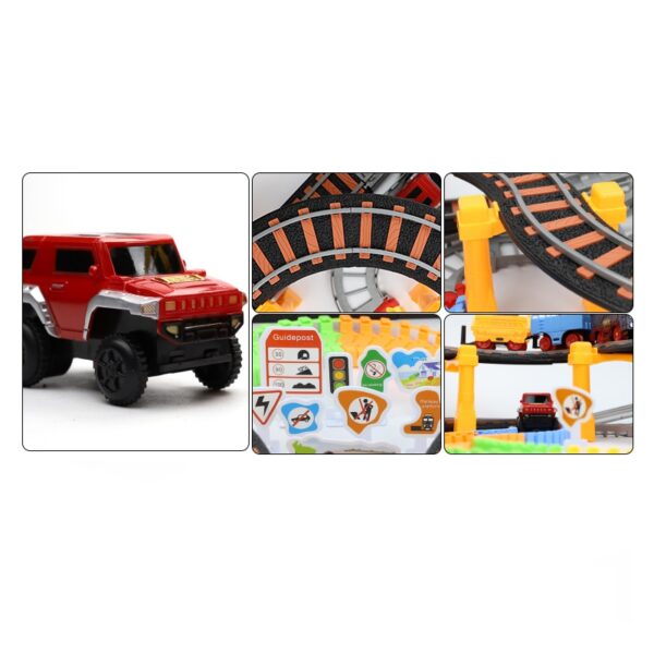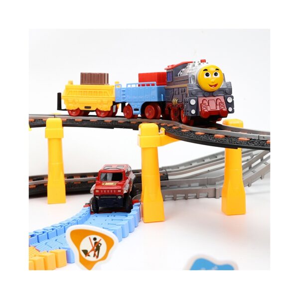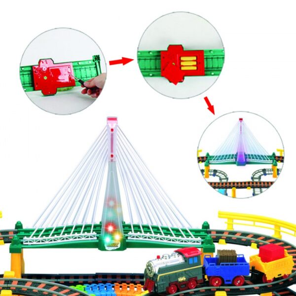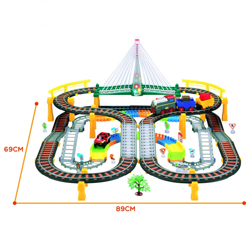 Tor Wyścigowy + Kolejka Elektryczna 2w1 od marki WOOPIE został stworzony z myślą o małych wielbicielach wyścigów samochodowych! Dodatkowym atutem zestawu jest dołączona do niego kolejka oraz wiadukt. Pojazdy poruszają się po osobnych torach, dzięki czemu ten rewelacyjny zestaw to zabawka 2w1. Lokomotywa posiada 2 wagoniki, w których mały kolejarz może umieścić załadunek. Tory są niezależne – można jeździć jednocześnie pociągiem i samochodem. Barwna kolorystyka oraz jakość wykonania zabawki nadaje niepowtarzalny klimat i dodaje autentycznego wyglądu. W komplecie znajdują się także drzewka oraz inne elementy, które urozmaicają otoczenie toru. Zestaw zawiera aż 192 elementy w tym lokomotywę, samochód i zwodzony most z kolorowymi światłami. Dodatkową zaletą zestawu jest realistyczny dźwięk, który wydaje kolejka! Zabawka jest w pełni bezpieczna dla Twoich najmłodszych. Maluch podczas zabawy rozwija swoje zdolności manualne i wyobraźnię.