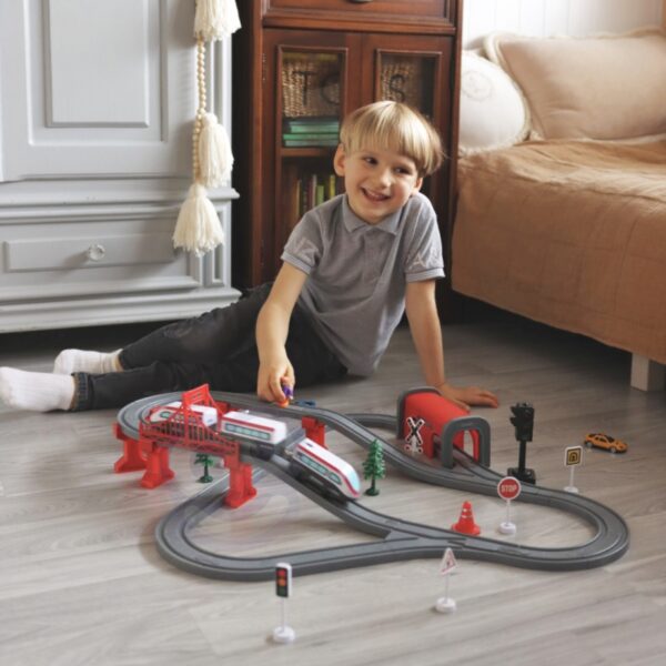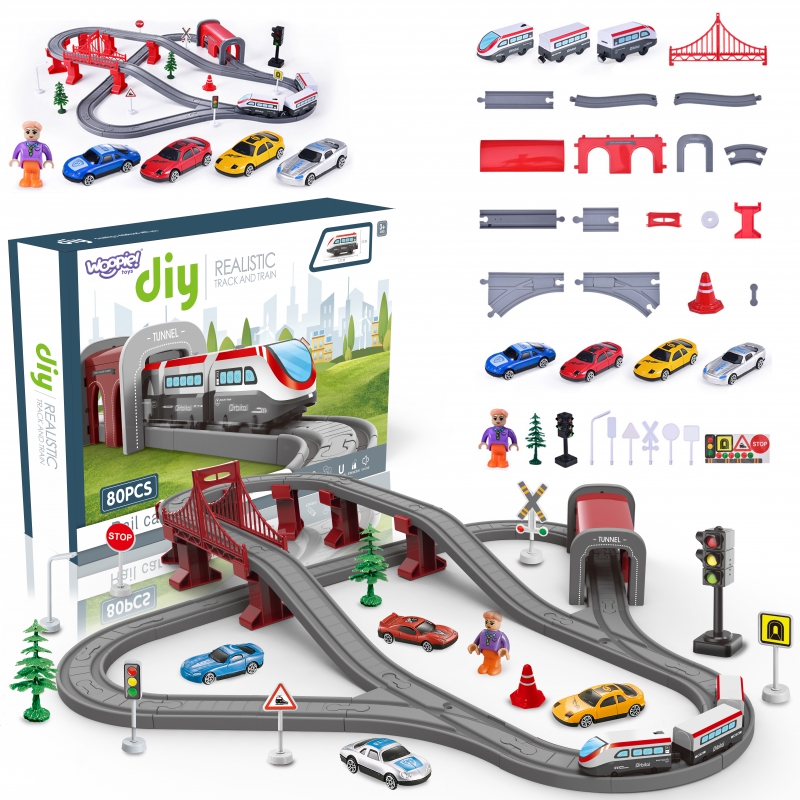 Kolejka Elektryczna od renomowanej marki Woopie to idealna propozycja dla fanów motoryzacji i kolei. Kolorowa kolejka ucieszy dzieci w każdym wieku, przysporzy wielu atrakcji i nieskończonych emocji. Zestaw zawiera 80 elementów, w tym m.in. nowoczesną lokomotywę na baterie, elementy toru, znaki drogowe oraz samochodziki. Zabawka ta, to jednak nie tylko mnóstwo radości, ale także ogromne możliwości rozwoju dla dziecka. Szczególnie rozwija się orientacja przestrzenna, zmysł techniczny oraz oczywiście wyobraźnia. Kolejka pakowana w oryginalne pudełko, idealnie nadające się na prezent.