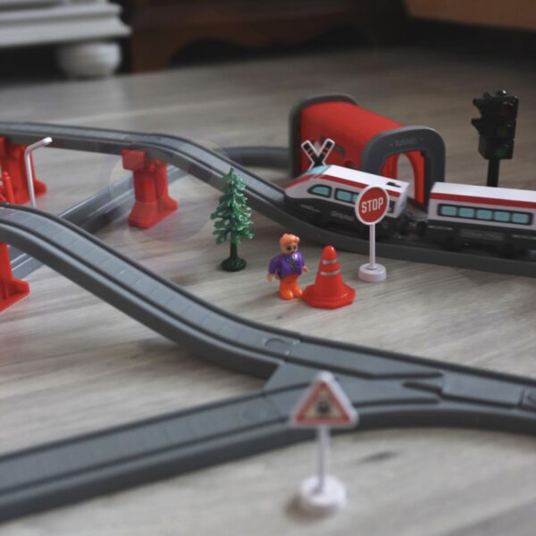- – lokomotywa (ok. 12 x 5 cm) (zasilana bateriami 2 x AAA, brak w zestawie),