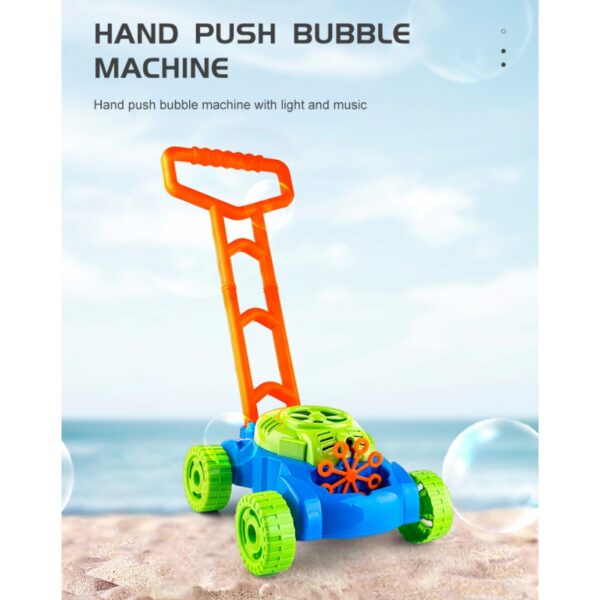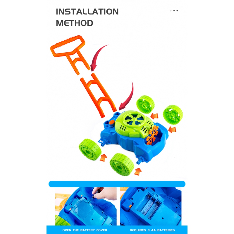 Bańki puszczane są automatycznie. Mały wiatraczek znajdujący się w górnej części obudowy silnika kosiarki, wytwarza strumień powietrza, który kierowany jest na 8 kręcących się pierścieni. Zanurzają się one w pojemniku na płyn do wytwarzania baniek i po kolei podsuwają pod małą dyszę. W ten sposób bańki puszczane są nieustannie. Dzięki 8 pierścieniom, zabawka wytwarza równocześnie dużą liczbę baniek. Dodatkową zaletą kosiarki są wydawane przez nią dźwięki. Dźwięki jakie możemy usłyszeć to dźwięk baniek mydlanych oraz melodia z bajki. Przy tylnych kółkach umieszczone zostały plastikowe zakładki, które podczas jazdy terkoczą imitując tym samym odgłos wydawany przez prawdziwe urządzenie. Bajecznie kolorowa kosiarka to propozycja niekończącej się zabawy, pobudzającej kreatywność i rozwijającej zdolności manualne. Możesz mieć pewność, że maluch nie będzie miał czasu na nudę.