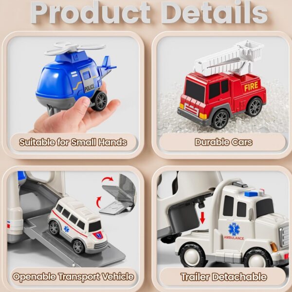Duży Zestaw Ratunkowy Ciężarówka+4 Auta od Marki Woopie Zaprojektowana z myślą o małych pasjonatach straży pożarnej, policji,pogotowia ta zabawka 5 w 1 to idealny zestaw dla każdego małego ratownika! Naciśnij przycisk na górze kabiny ciężarówki, aby zobaczyć jasne migające światła i usłyszeć realistyczne syreny, bardzo atrakcyjne dla dzieci. Zestaw zawiera dużą ciężarówkę transportową oraz cztery pojazdy ratunkowe: samochód strażacki, radiowóz, helikopter policyjny, karete. Każdy z pojazdów ma ruchome elementy, które pozwolą Twojemu dziecku poczuć się jak prawdziwy bohater podczas akcji ratunkowych! Zestaw jest świetnym pomysłem na prezent urodzinowy, świąteczny czy na inne okazje.