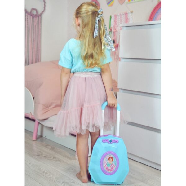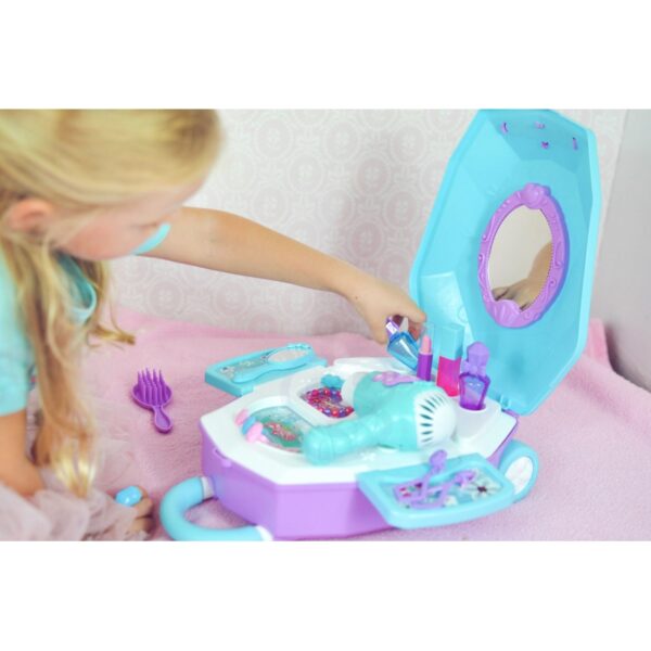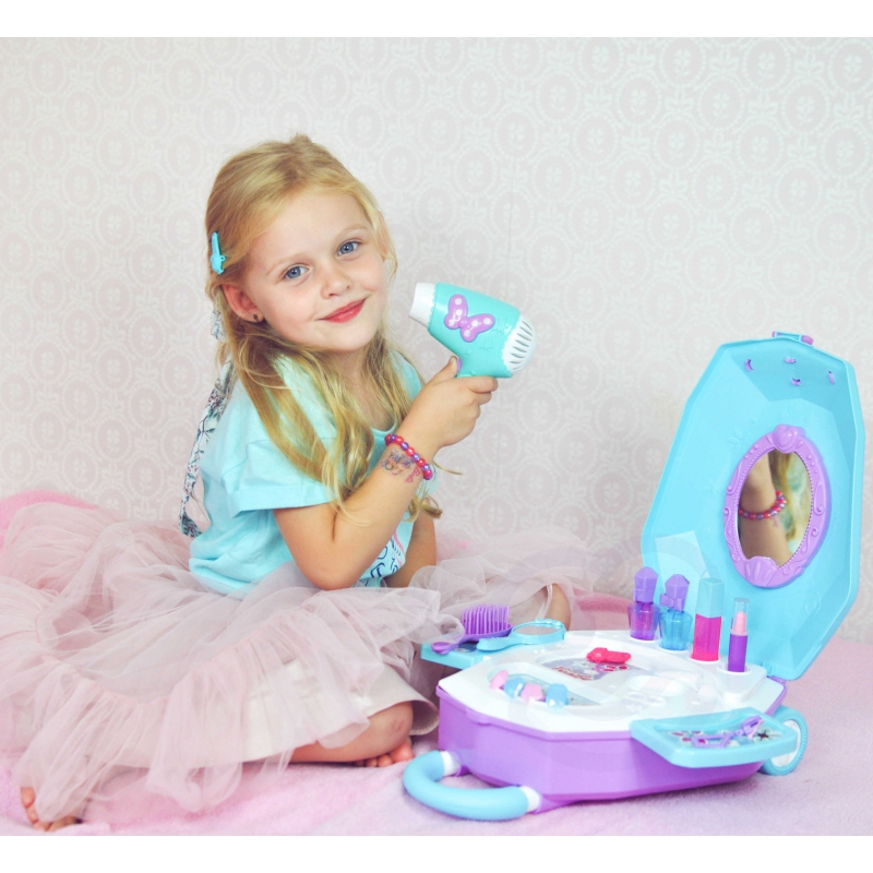 Toaletka dla Dziewczynki 2w1 Salon Piękności w Walizce od marki WOOPIE to idealna propozycja dla wszystkich małych księżniczek. Dzięki temu zestawowi dziecko może poczuć się jak prawdziwa księżniczka oraz posiada wszystko, aby przygotować się na wielki bal lub wyjście z przyjaciółmi. Wewnątrz walizki znajduje się lusterko i rozkładany blat toaletki. Zestaw oprócz akcesoriów jak lusterko, spinki czy szczotkę posiada, również suszarkę na baterię, która działa jak prawdziwa – dmucha powietrzem. Kosmetyki i inne akcesoria idealnie odwzorowują rzeczywiste przedmioty, co pozwoli wcielić się w małą księżniczkę!