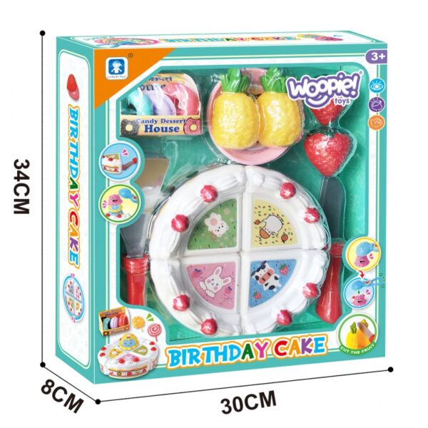 Zestaw do herbaty z tortem od marki Woopie to idealna propozycja na spotkania z przyjaciółmi. Zestaw urodzinowy będzie idealnym atrybutem każdej małej gospodyni czy małego gospodarza do zorganizowania niezapomnianego przyjęcia. Dziecko może wcielić się i poczuć się jak dorosły gospodarz domu. W zestawie znajdziemy pięknie udekorowany tort, który możemy pokroić na 4 kawałków i poczęstować swoich gości. W skład zestawu wchodzą także inne przekąski, np. ciasteczka i owoce, a do tego również nóż do krojenia tortu i owoców, talerzyk na tort i szpatułka do podnoszenia ciasta. Krojenie tortu i owoców jest doskonałą zabawą, która rozwija zdolności manualne dzieci. Zabawy w odgrywanie ról pozytywnie rozwijają dziecko – rozwijają wyobraźnię i kreatywność.
