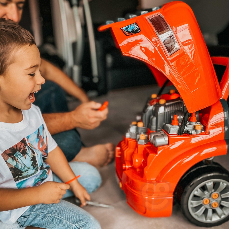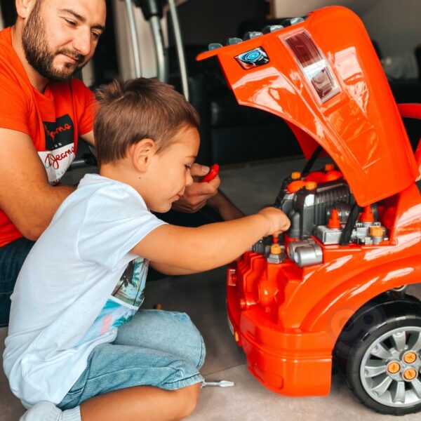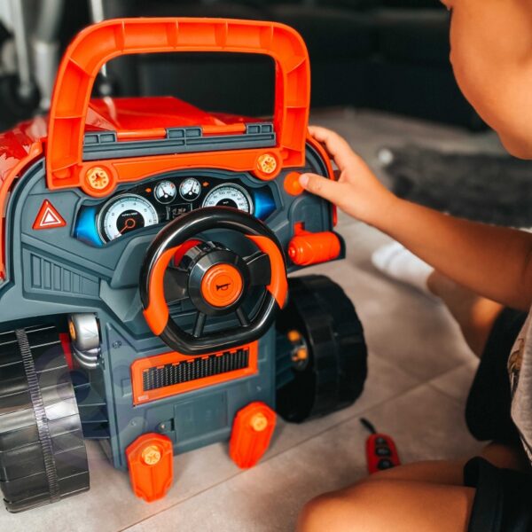Zabawka imitująca przód ciężarówki marki WOOPIE z podnoszoną maską, kierownicą oraz deską rozdzielczą. Po otworzeniu schowku pod kierownicą dziecko znajdzie w środku mnóstwo atrakcji w postaci narzędzi, pokręteł i śrub. Młody mechanik może dokonywać wielu napraw i przeglądów swojego pojazdu (np. kół, błotników, silnika, świec zapłonowych, grilla chłodnicy). Zabawka wyposażona jest w moduł dźwiękowy (odgłosy silnika i klakson) i świetlny (świecą reflektory). Dodatkowo w zestawie jest pilot umożliwiający sterowanie modułami. W celu zdjęcia kół można zastosować umieszczony w zabawce podnośnik. Z całą pewnością jest to zestaw jedyny w swoim rodzaju, oferujący niezliczoną ilość możliwości zabawy.