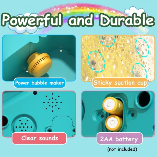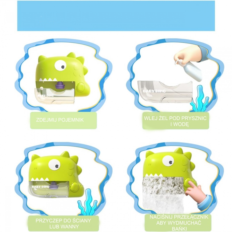 Maszyna do robienia baniek w kształcie dinozaura marki WOOPIE to świetna zabawka do kąpieli mająca pojemność 250 ml a wbudowany mocny silnik może automatycznie wygenerować ponad 5000 bąbelków dzięki czemu szybko napełnisz całą wannę. Maszyna do baniek mydlanych wykonana jest z wysokiej jakości ABS, z wodoodpornością IP6 a funkcja muzyki idealnie sprawdzi się na zewnątrz. Ulepszone przyssawki łatwo adsorbowane na gładkich powierzchniach, super przylepne dzięki czemu łatwo nie spadają. Dynamiczna muzyka i bąbelki inspirują dzieci do zabawy podczas kąpieli a maszynę można wyłączyć w dowolnym momencie.
