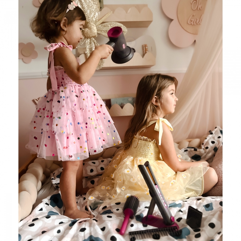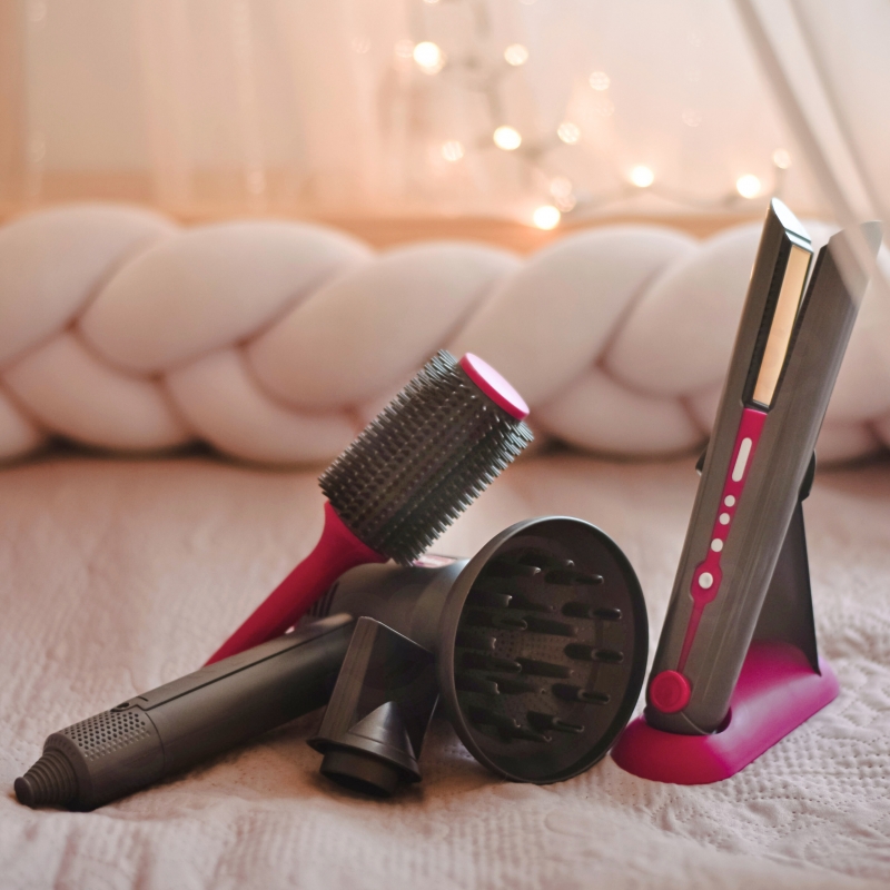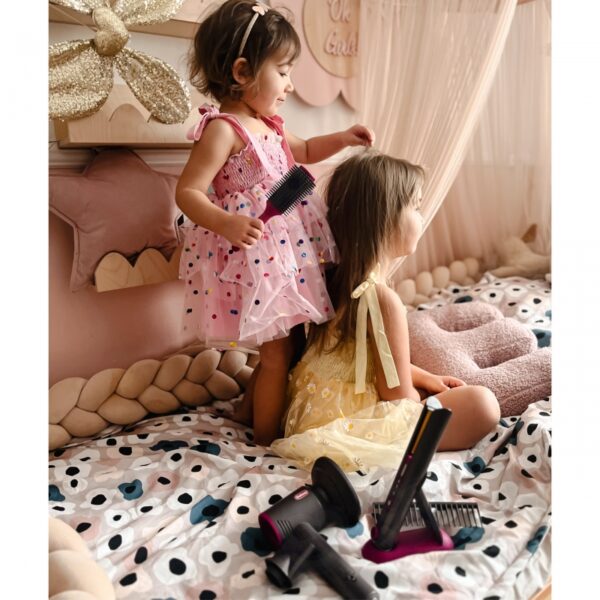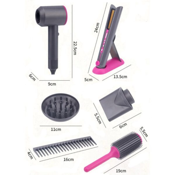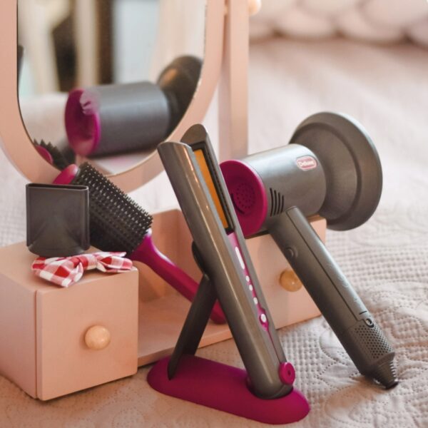 - – w zestawie: zabawkowa suszarka do włosów, nasadki, szczotka, grzebień do rozczesywania, itp.