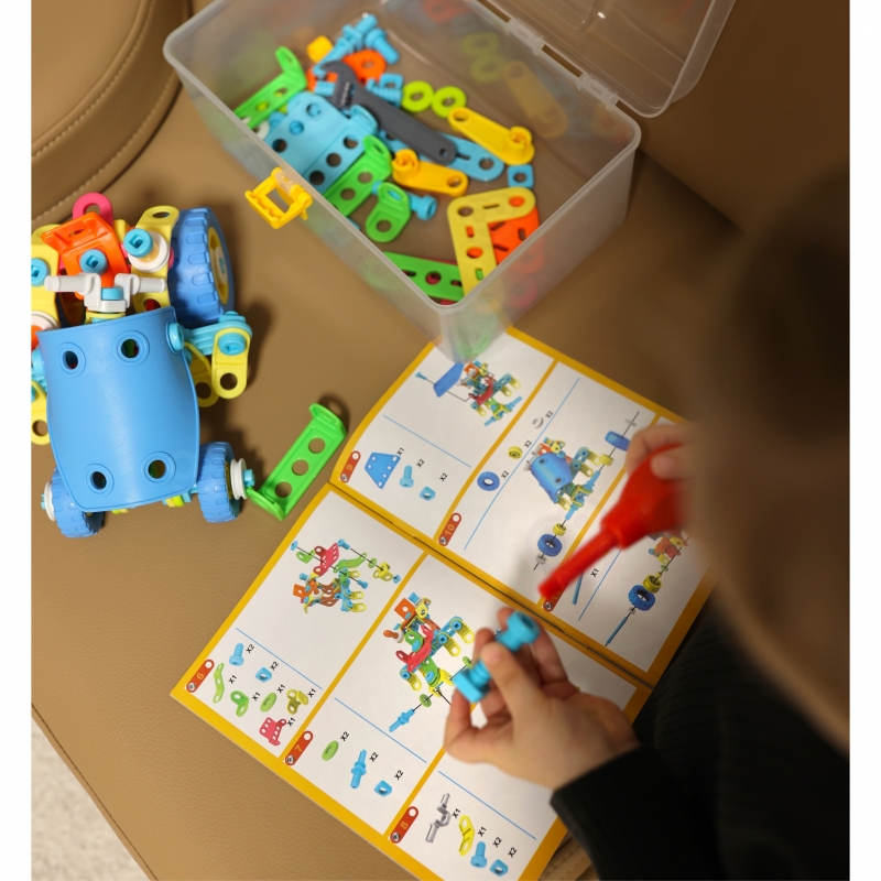 - Zestaw zawiera: Różnokształtne klocki, Śrubokręt i klucz płaski, Śruby mocujące z nakrętkami, Koła, Obrazkową instrukcję do zbudowania 6 różnych pojazdów