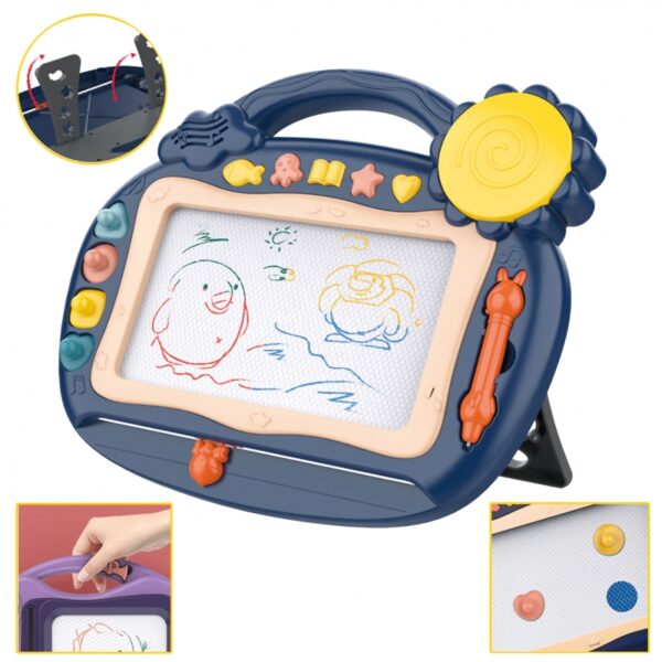 Znikopis Tablica Magnetyczna daje możliwość kreatywnej zabawy na długi czas! Tablica zachęca do pisania i rysowania. Rysowanie pozwoli wyciszyć i uspokoić się Twojemu dziecku. Znikopis pozwala na tworzenie nieskończonej ilość obrazków – wystarczy przejechać specjalnym suwakiem, a rysunek zniknie i można rysować od nowa! Zestaw dodatkowo zawiera wygodny długopis oraz aż 4 stempelki, które urozmaicą dzieło. Dodatkowo 5 multi funkcyjnych guzików, które mają ponad 400 opcji dźwiękowych, w tym: efekty dźwiękowe, taneczne piosenki dla dzieci, elektroniczne dźwięki, alfabet angielski oraz bęben. Tablica posiada wygodny uchwyt, dzięki czemu dziecko może zabrać ją wszędzie oraz posiada możliwość wystawienia nóżek, które ułatwia dziecku pisanie przy stole. Znikopis rozwinie u dziecka zdolności manualne, wyobraźnie, kreatywność oraz da szansę na rozwinięcie artystycznej strony dziecka!